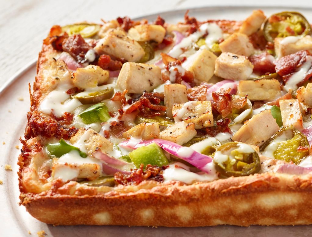 EVOO, mozzarella/provolone cheese blend, red onion, green pepper, bacon, jalapeno, chicken, ranch drizzle