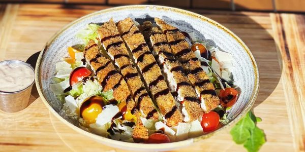 Chopped lettuce, cherry tomato, shaved asiago & Parmesan cheese, sliced Italian breaded chicken cutlet, with creamy Parmesan dressing topped with balsamic glaze. 13