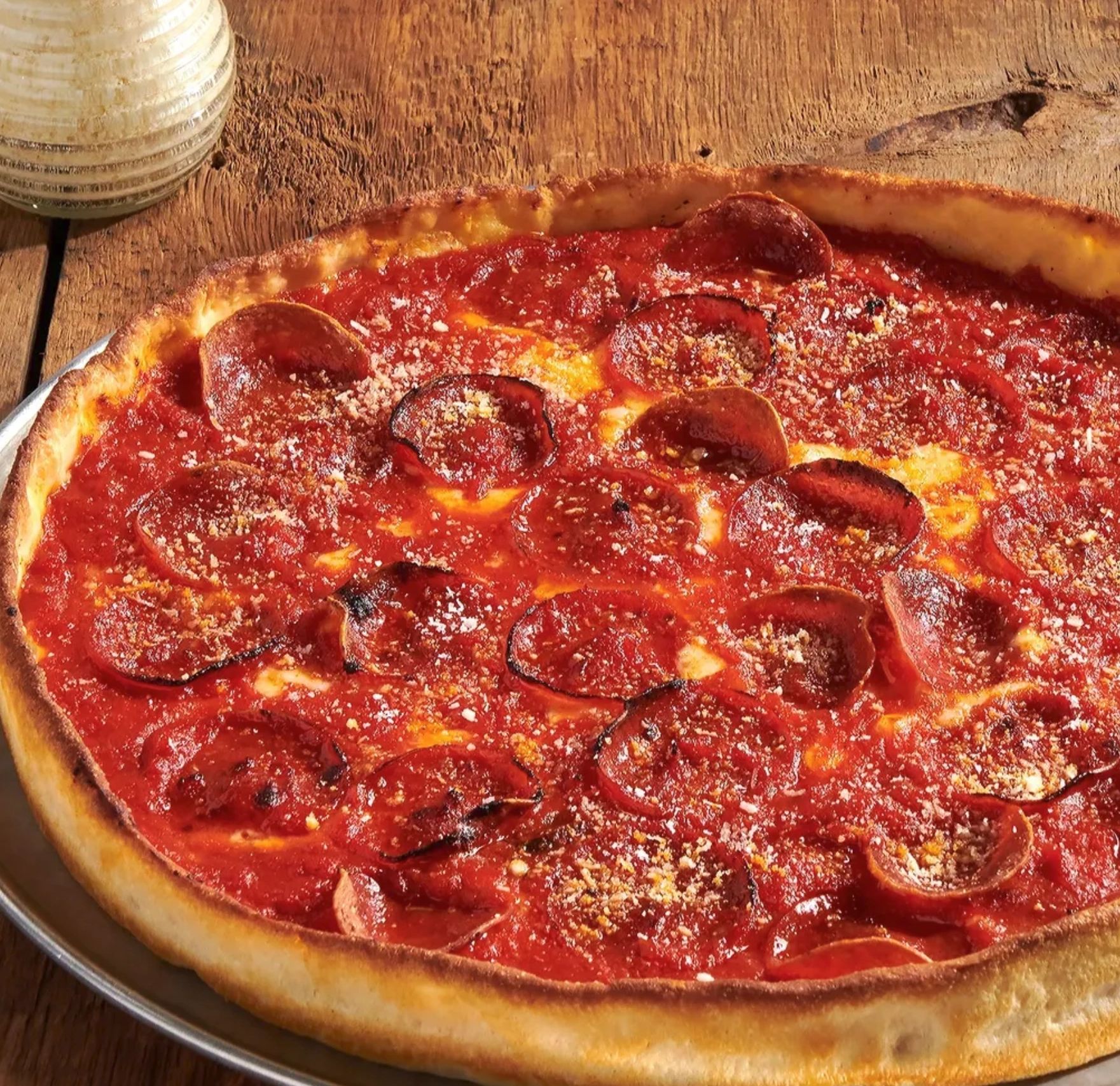 Sicilian sauce, provolone, old world pepperoni, thick-cut pepperoni, Romano & Italian spices