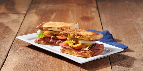 Pepperoni, ham, salami &mozzarella topped with lettuce,onions, tomatoes, vinaigrette & banana peppers. Served with fries. 14
