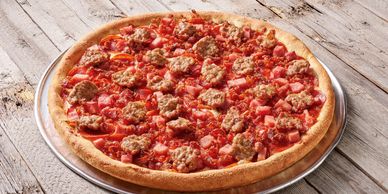 Red sauce, provolone blend, pepperoni, bacon, ham, sausage